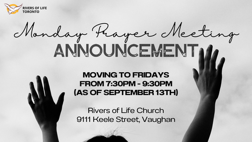 Please note that starting September 13, our weekly prayer meeting will be on Fridays instead of Mondays from 7:30 pm - 9:30 pm. Join us to experience the power of praise and worship and prayer among believers.